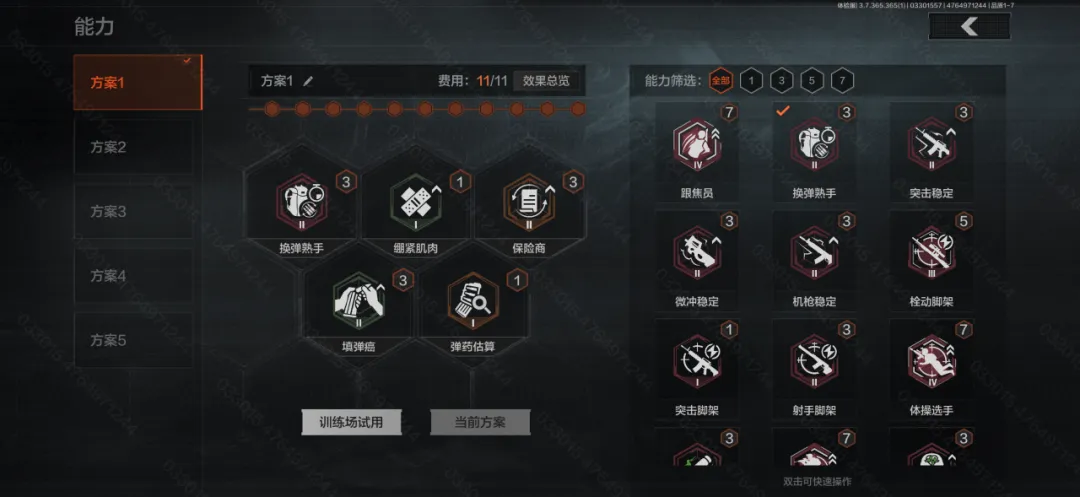 现在能力页面支持设置最多5套自定义方案;先锋现在还可在训练场临时解锁并试用全部能力,能更方便地进行能力配装与解锁选择。