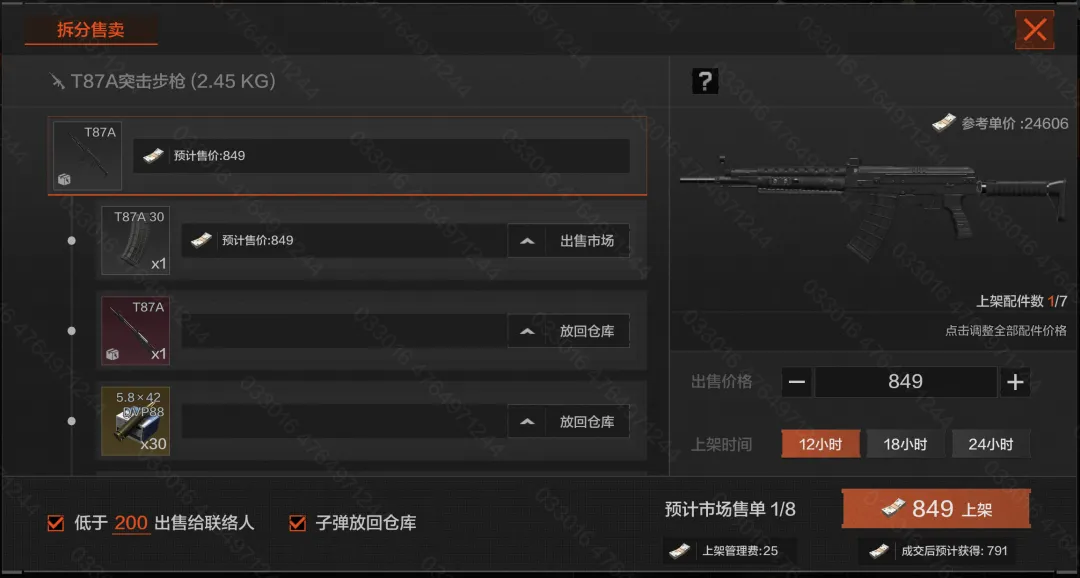 拆分上架仅计为一单,并新增“全枪总计售价”展示及子弹放回仓库选项。
