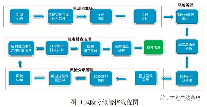 系统提供风险清单库,实施涵盖从安全策划准备、风险辨识、风险评价、风险分级管控的全过程管理。实施流程如图所示: