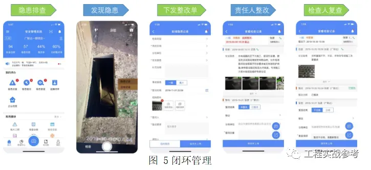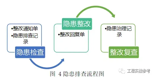 隐患排查治理流程:安全人员检查发现问题后对隐患部位进行拍照,下发整改单通知责任人,责任人进行整改,整改完成后安全员进行复查,复查合格后问题关闭,复查不合格,回到责任人继续进行整改,整改完成后再复查。直到问题合格,完成管理闭环。