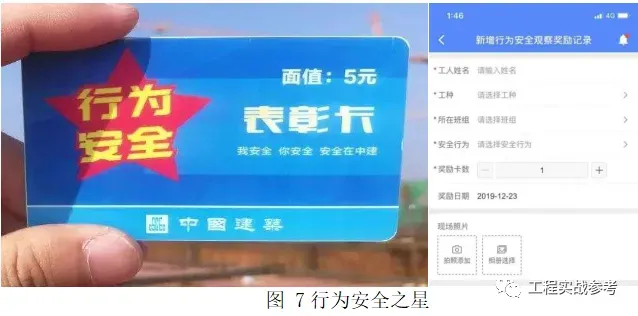 项目设置4名“行为安全之星”观察员,安全观察员每天巡视巡查,对作业人员进行观察考核,对满足考核要求的作业人员发放“行为安全表彰卡”,同时通过安全管理系统对发卡行为进行登记记录,方便后续对发卡数量进行统计和“行为安全之星”的评选。