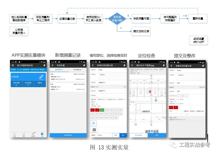 系统手机端提供实测实量功能,现场检查人员在进行实测实量工作时,通过手机及时记录测量信息,系统后台对测量结果自动汇总。全过程记录现场实测实量管理工作,提高一线工作人员工作效率。