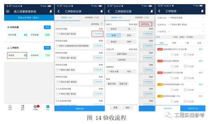 质量管理系统,以海量的数据清单和学习资料为数据基础,对施工生产中各种质量问题进行具体的管理与控制,包括质量巡检、实测实量、工序验收和检查评优。
