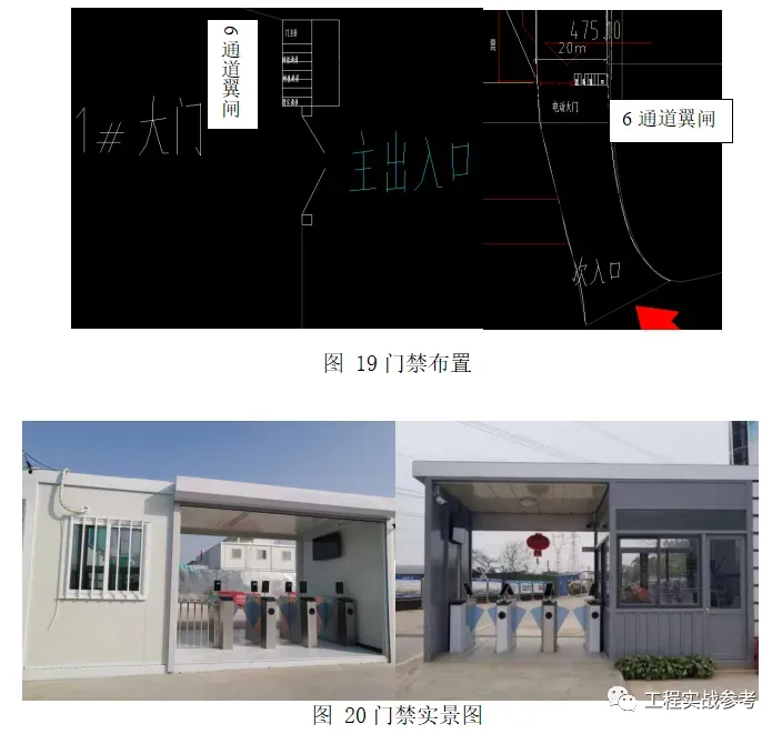 根据平面布置,现场设置两个出入口,本项目高峰期施工人数预计2000人,根据项目经验,双通道5分钟可通过100人,预估本项目一个出入口设置6通道翼闸,可保障项目高峰期正常通勤。