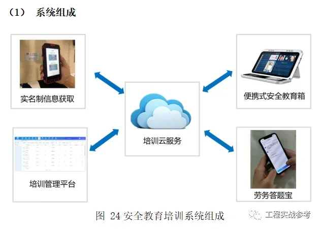 系统由速登宝获取实名制信息、便携式安全教育箱、微信小程序或答题器、培训管理平台与培训云服务关联组成。