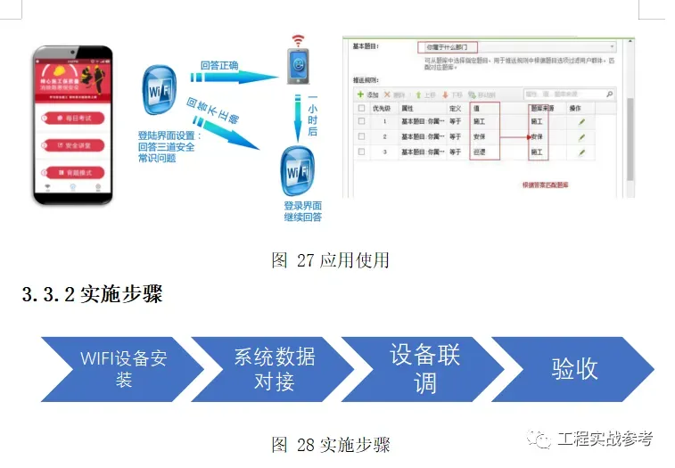 在工人生活区提供无线WIFI发射器一个,工人在上网前需要经过认证,回答内置试题,通过认证后方可上网,潜移默化中提高工人安全防护意识;