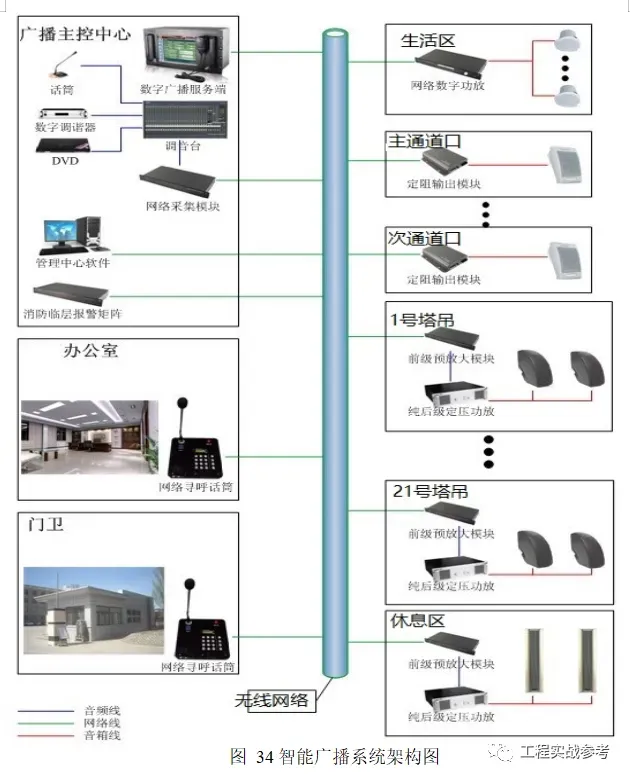 智能广播系统,安装在工人生活区、现场主通道、塔吊及休息区,通过IP定位,实现手机点对点喊话,并与智能监控系统联动,实现自动告警播报,同时可设置定位广播,自动播放安全知识,提高工安全意识;
