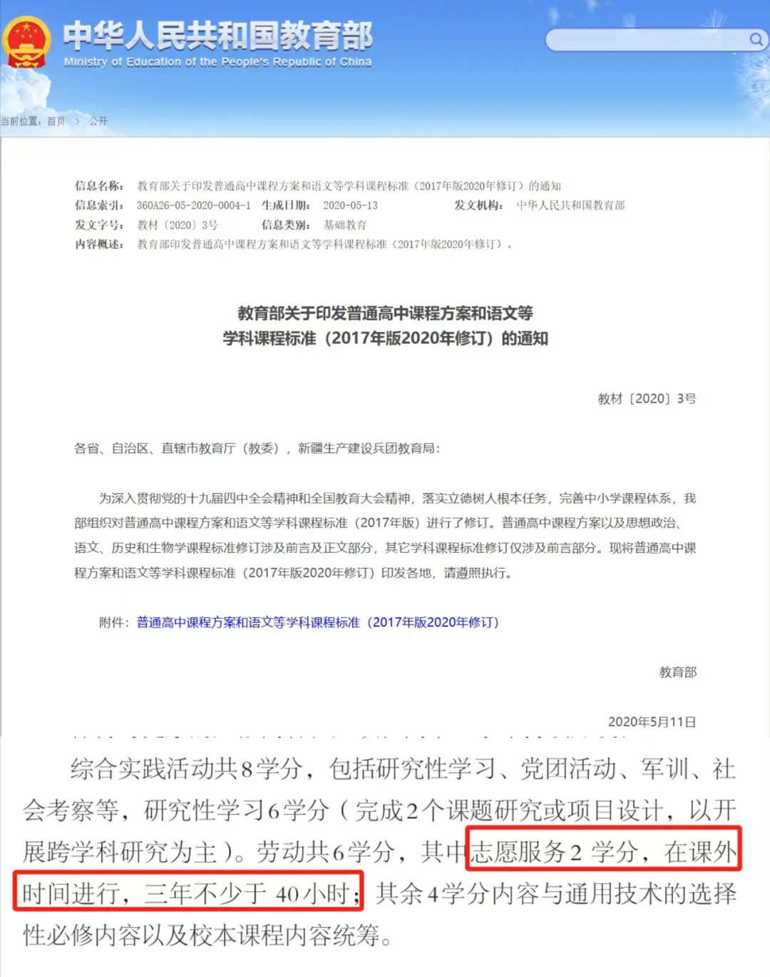 教育部“普通高中课程方案和语文等学科课程标准(2017版2020年修订)”,将志愿服务纳入了高中学生的必修课程,2个学分,需要学生在高中三年内完成不少于40小时的志愿服务且需要学生在课外时间进行,学校不予提供相应课程。缺少这2学分,学生将无法毕业。