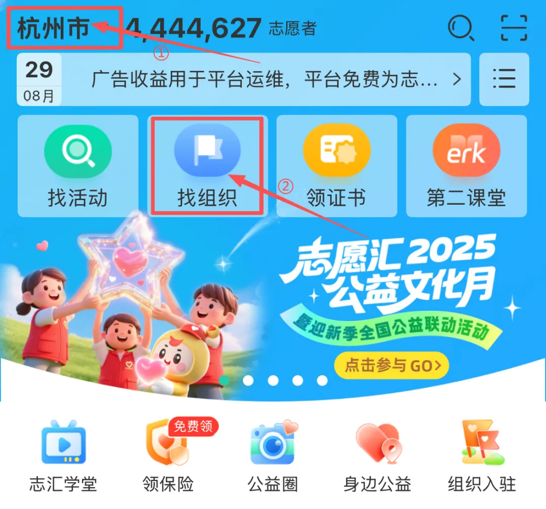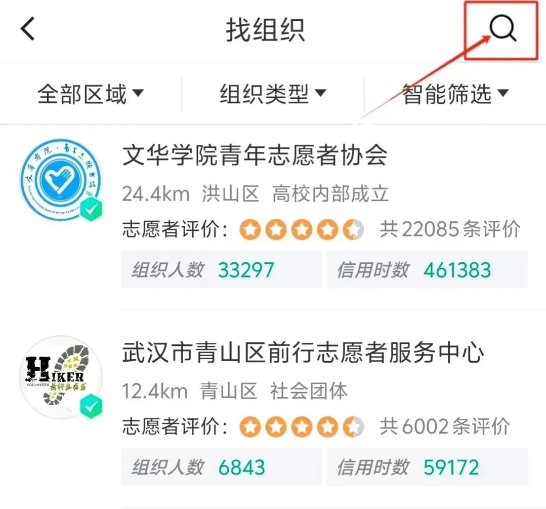 搜索查找自己想加入的志愿服务组织(学校)名称