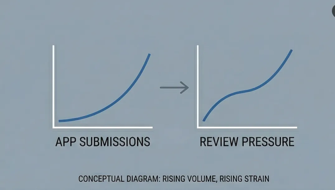 结果也很典型:审核开始变慢,排队开始拉长,真正认真做产品的人,不得不和大量模板化、短平快的东西挤在同一条通道里。