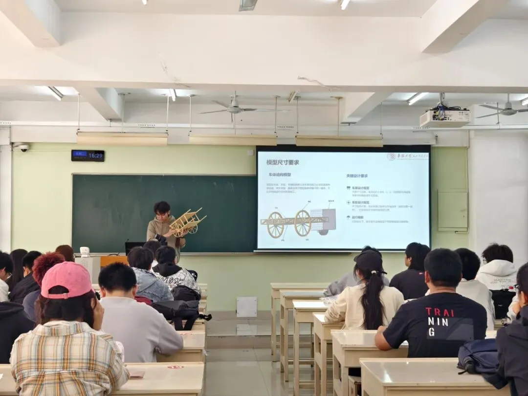 会议伊始,阮羿佑老师进行致辞,鼓励所有参赛同学全力以赴,争取在本届比赛中取得优异成绩。紧接着,冉东泽为在场的选手们简要介绍了本次赛题的背景,随后详细解读了本届比赛的赛题——《勒勒车模型结构设计与制作》,并通过模型生动地讲解了比赛的注意事项、加载流程以及评分细则,确保每位参赛者都能充分理解比赛要求。