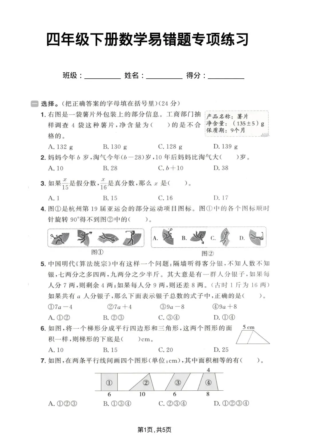 今日分享:四年级下册数学易错题专项练习来啦!覆盖全册高频易错点,针对性查漏补缺,练一题抵十题,帮孩子避开考试陷阱,提升正确率。