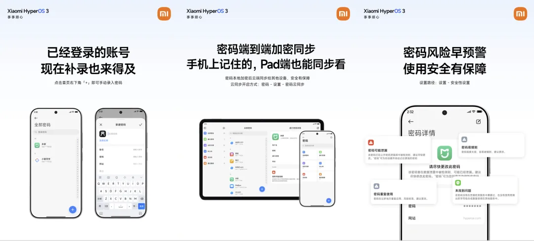 如上图所见,官方表示密码App首次登录自动抓取存储密码,用时一键填充,已登录的APP可手动添加,密码更改后会主动提醒,跨设备端到端加密同步,多设备共享也安全。