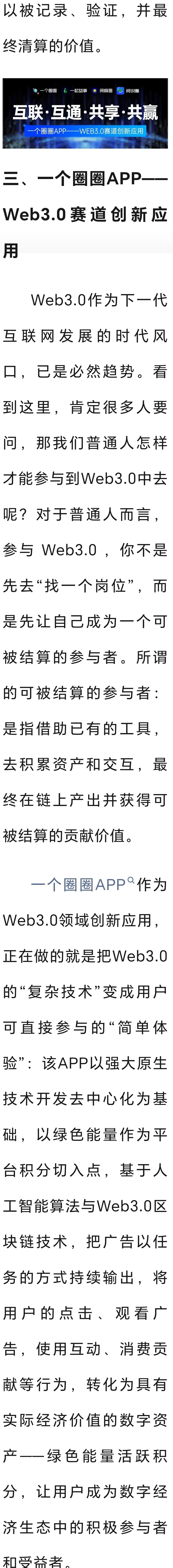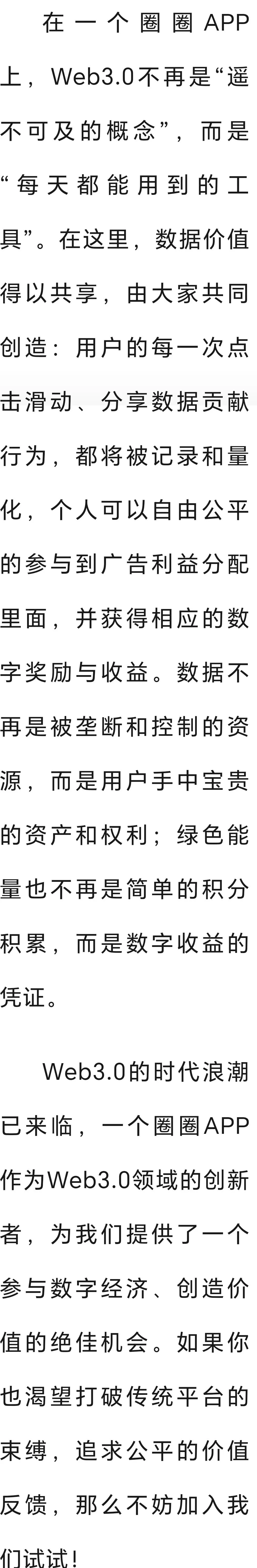 一个圈圈APP:Web3.0去中心化,引领数字经济未来 官方文章语音版,戳下开关收听↓ 👉🏻🔗一个圈圈及其矩阵aPP注册下载教程 👉🏻🔗拥有可增值可随时提现数字资产的具体操作 👉🏻🔗新人必看 👉🏻🔗了解一个圈圈 👉🏻🔗创始人聊平台