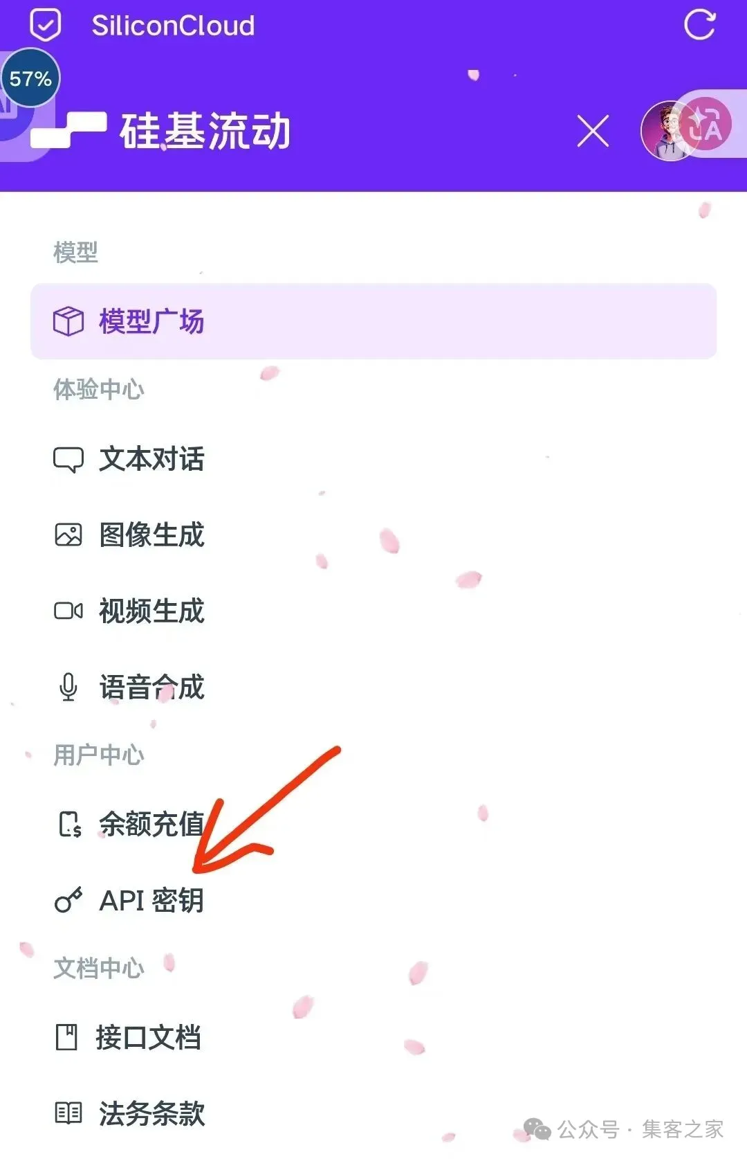 4,会直接跳转硅基流动官网,注册,登录,这个不多讲了,有手就会,然后点击头像旁边的三个杠,选择API密钥。