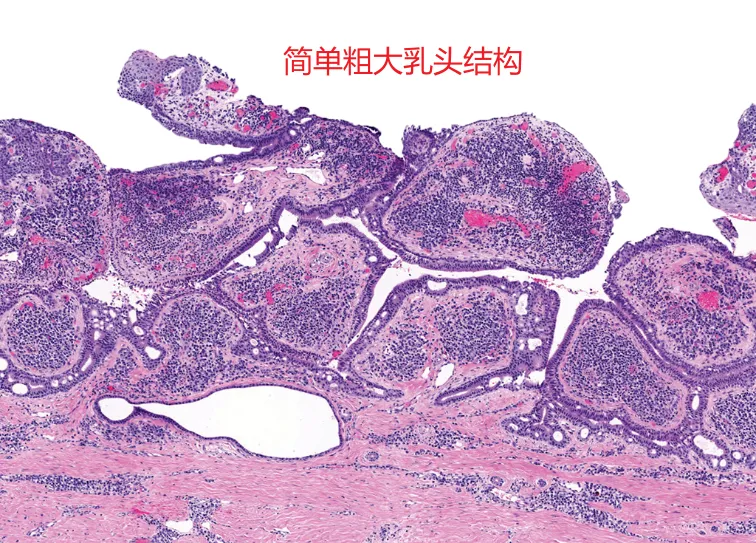 4、组织病理特征:开口于表皮,呈内生性火山口样生长,形成简单乳头结构,乳头表面可见两种细胞:内层细胞(柱状,可见顶浆分泌,胞浆嗜酸性)及外层细胞(基底样/肌上皮样细胞),两种细胞呈双层/多层排列。乳头间质可见多量浆细胞。