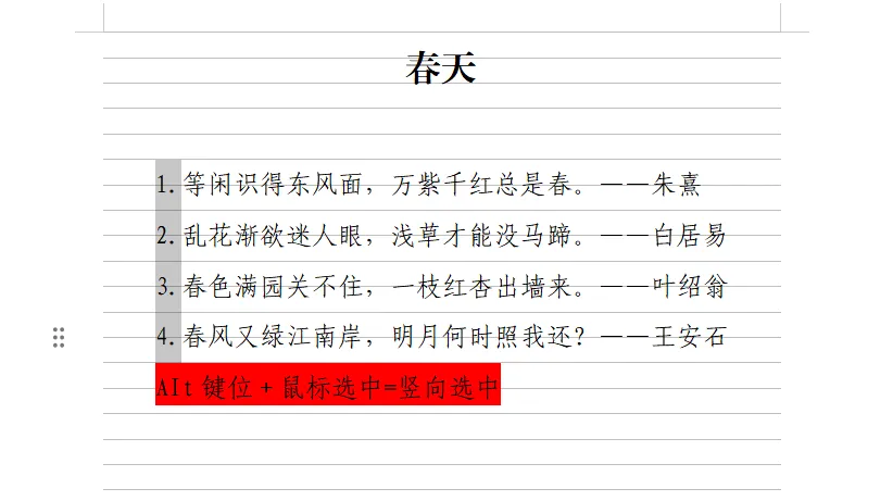 第二个“隐形机关”躲在Alt键后面。按住Alt,再用鼠标框选一个矩形区域——你会发现,原来文字也可以像截图一样竖着选中。当你想批量删除每一行开头的序号,或者调整多行文字的左侧空格,这个“竖选”功能就像一把隐形的剪刀,精准、利落,不伤其他文字分毫。