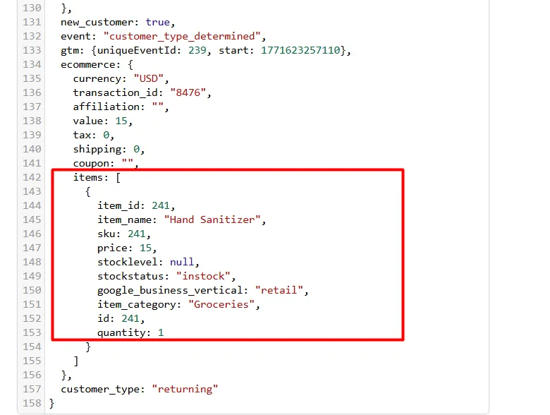 在这里,您可以看到商品数组的格式。当我们通过 GTM 配置事件并与网站连接时,我们将收集所有重要的数据。