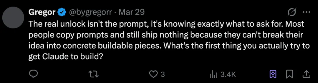 正如一位网友的评论,真正限制的不少Prompt,而是人们不知道如何去提问,也不知道自己要构建什么,把东西拆解成实际可落地的块块(Pieces)。