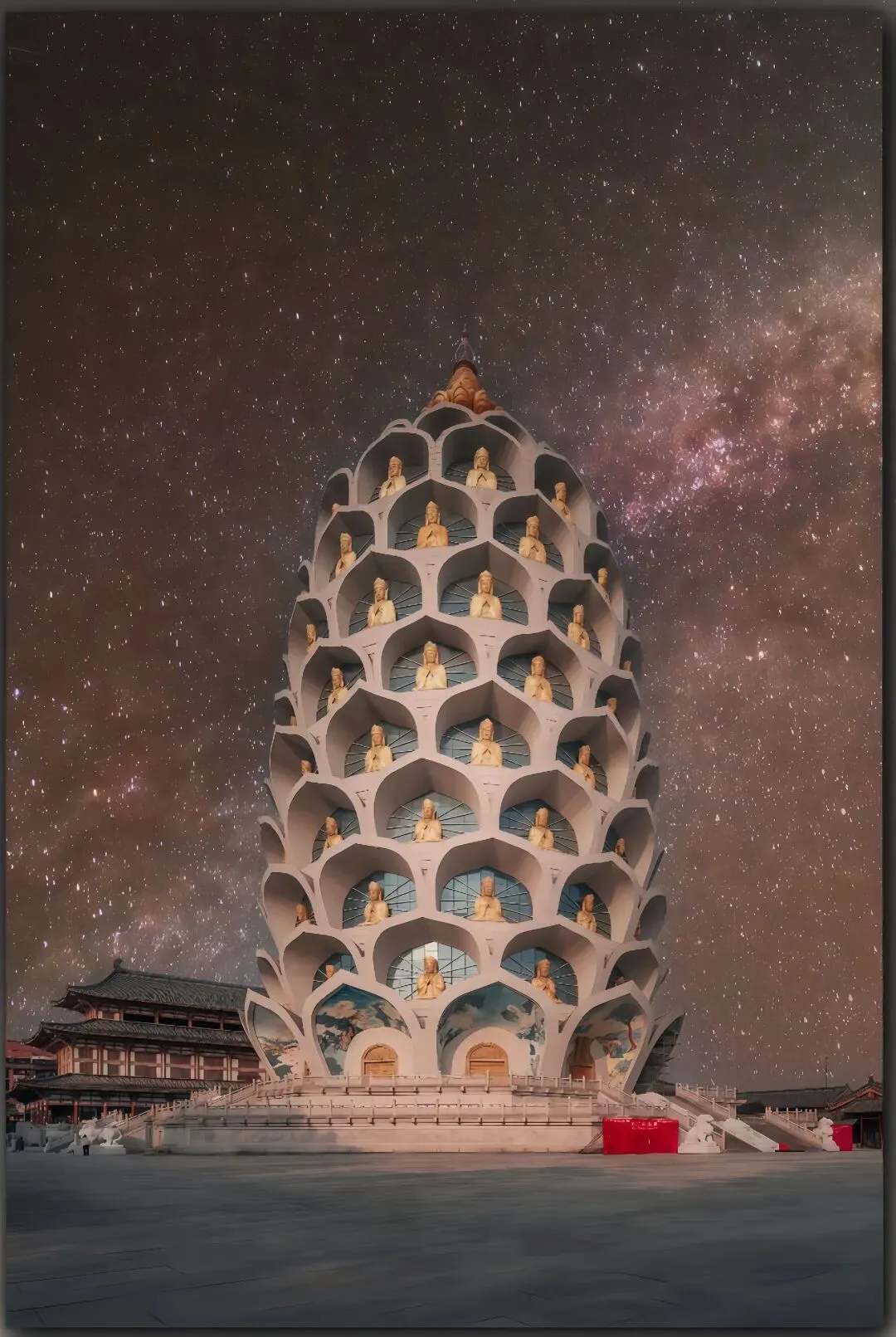 远看像菠萝,近看是莲花瓣,108瓣莲花佛龛+鎏金塔身。