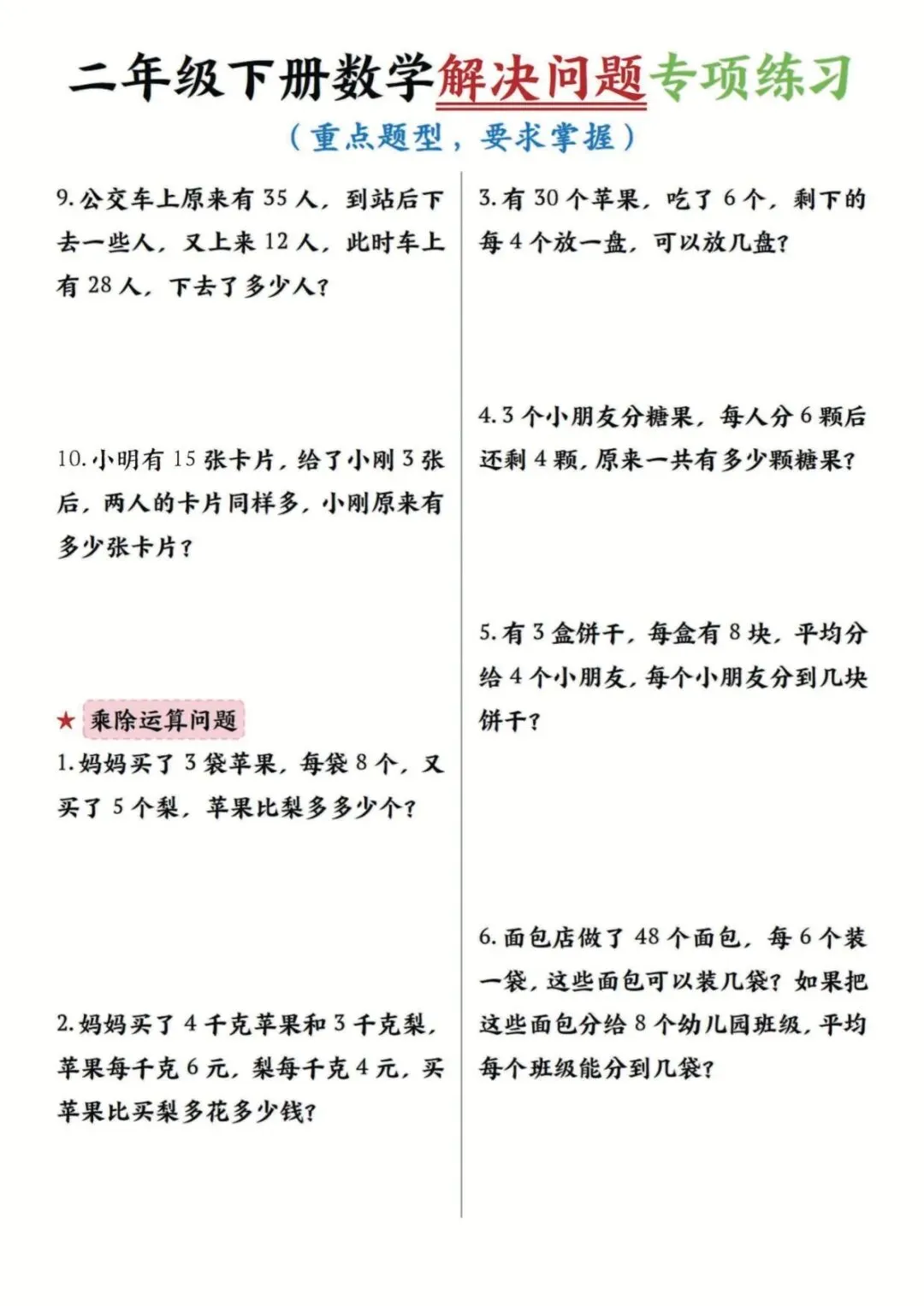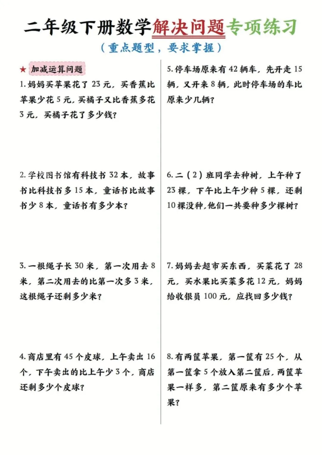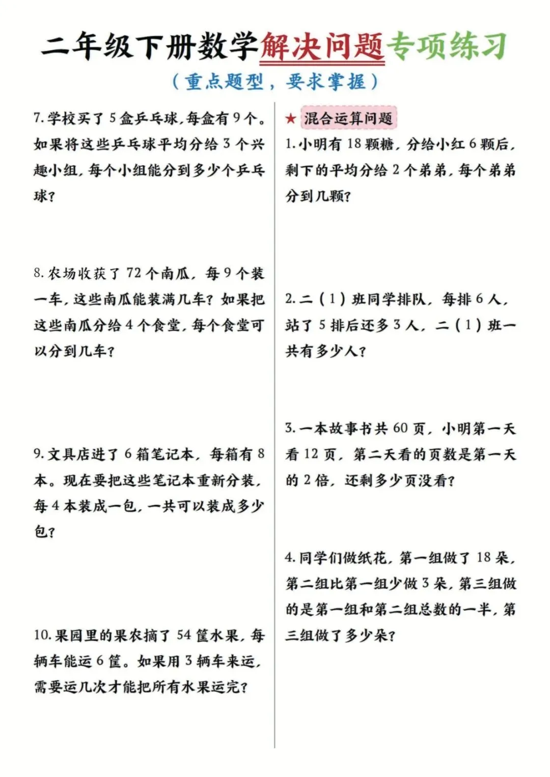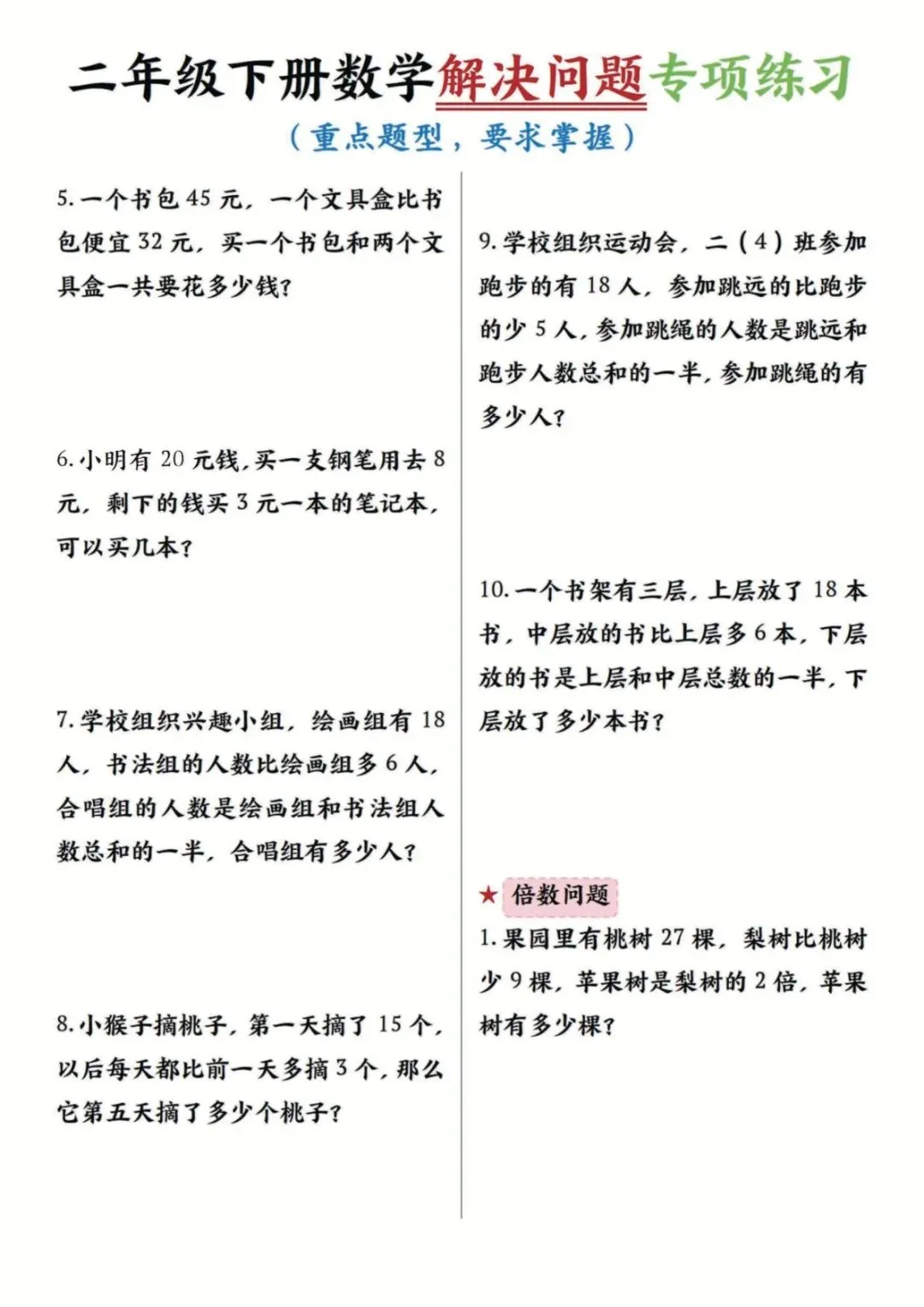 本资料同步人教版 2026 春二年级下册数学全册重点,专为解决问题(应用题) 专项训练设计,覆盖加减混合、乘加乘减、有余数除法、万以内数、克与千克、推理、统计、两步应用题等必考题型,由浅入深、易错突出、步骤清晰,含完整答案,可直接打印练习,是二年级学生攻克应用题、稳拿高分的必备专项资料。