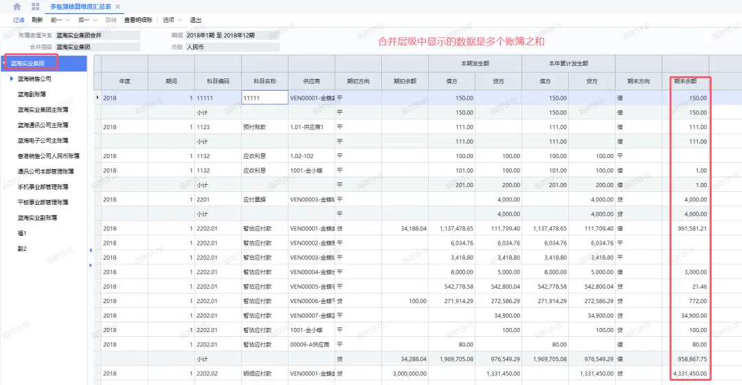 多账簿核算维度汇总表是一个既可以显示多账簿科目也可以显示多账簿核算维度的二维报表。合并层级中显示的是多个账簿的汇总数,左侧分组可以展开显示每个账簿各自汇总数。