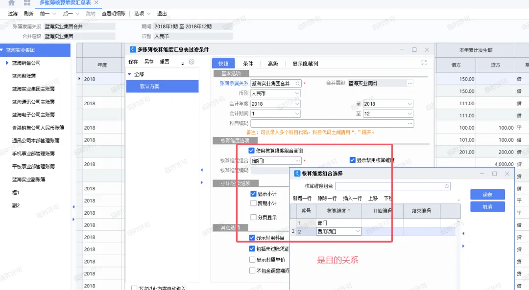 核算维度:如果不勾选使用核算维度组合查询,那就只能查询单一核算维度数据;如果勾选使用核算维度组合查询,那么必须选2个以上核算维度。