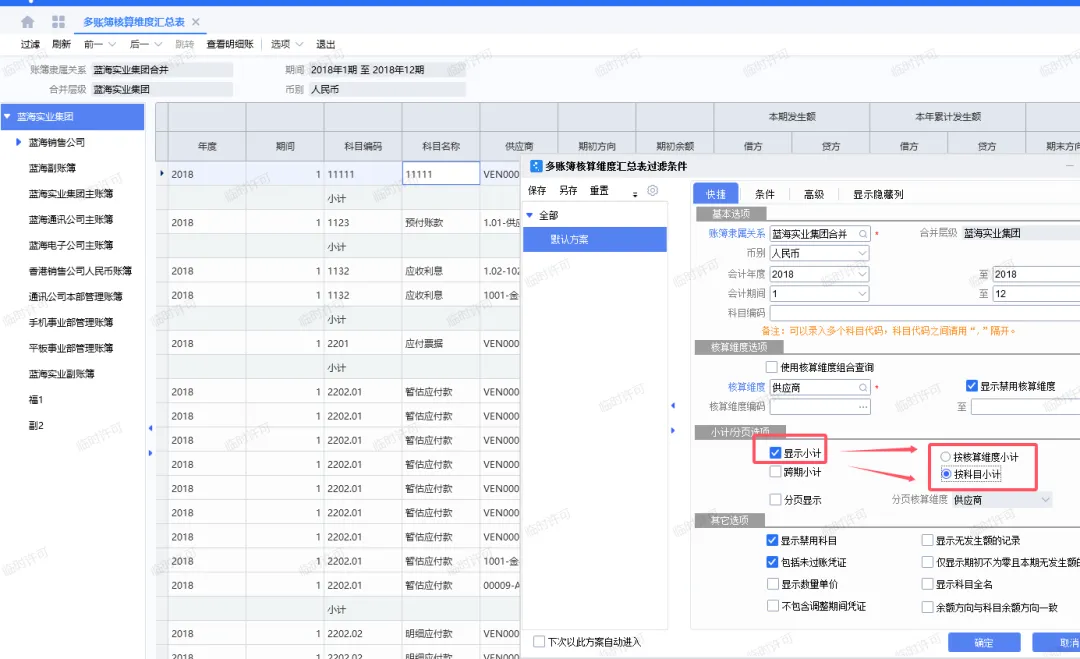 显示小计:勾选显示小计后,必须选择按科目小计或核算维度小计中的任意一种
