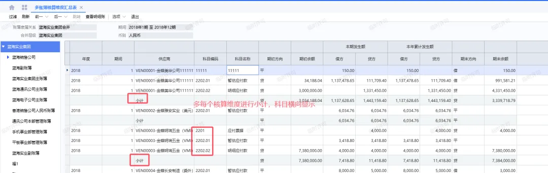 按核算维度小计后,每个账簿的数据会按核算维度小计,科目横向显示如下图。