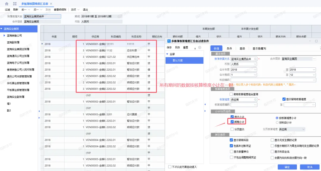 多期间合计:如果勾选这个参数,如下图会把多期间的数据小计在一起。