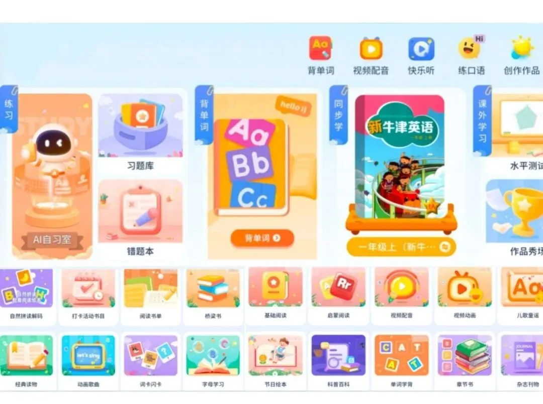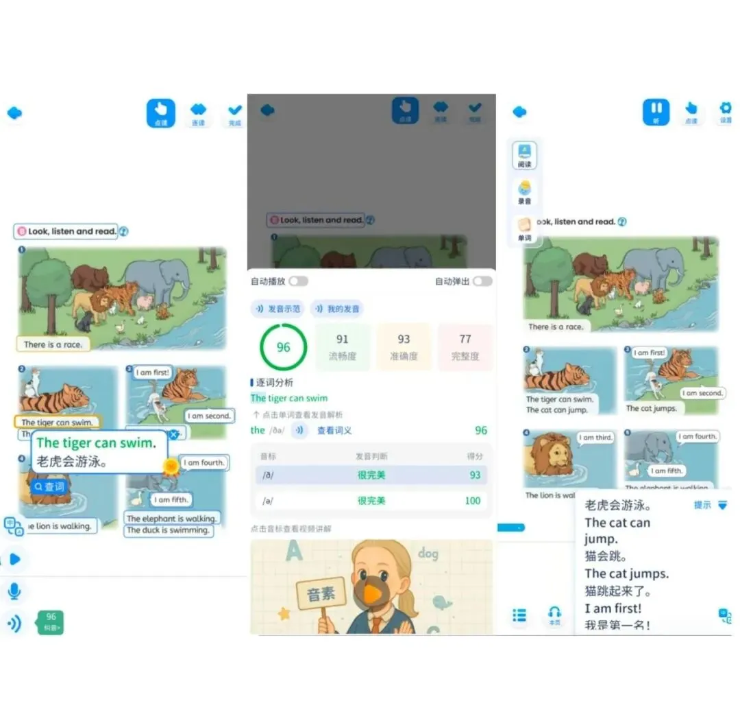 教材和绘本设置有有跟读功能,通过科大讯飞语音识别技术,智能检测孩子发音,音素级纠音,实时纠正孩子发音,且带有中文释义,就像有英语老师在旁边指导学习。