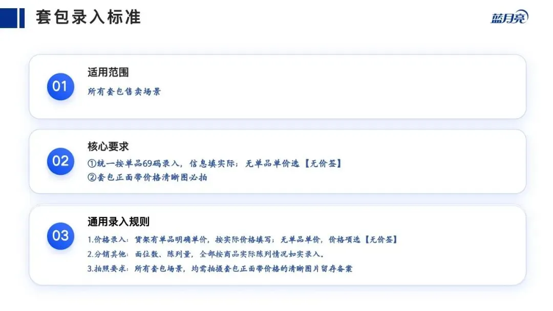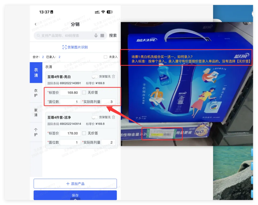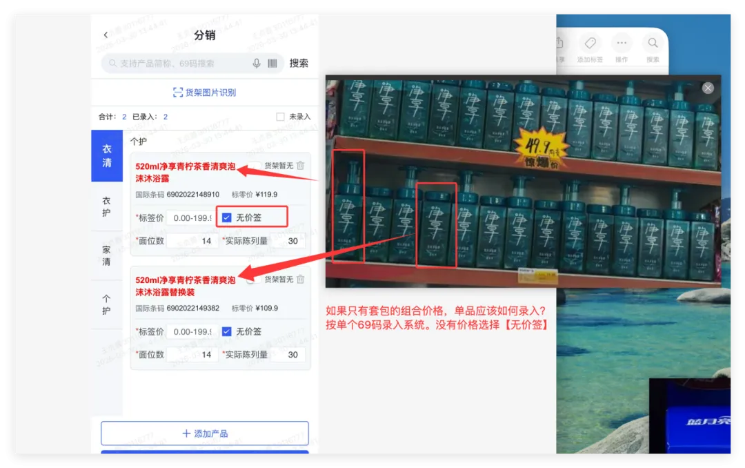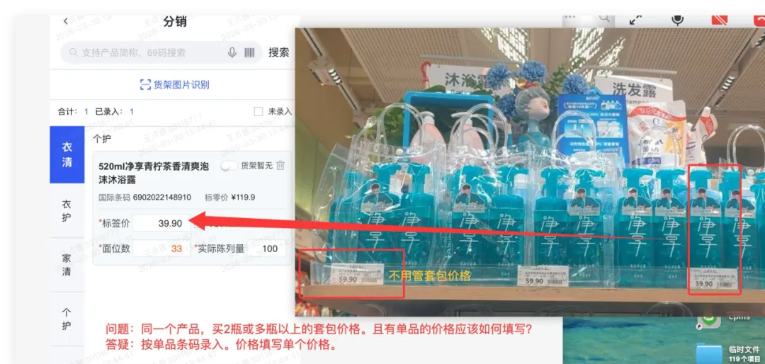 1、分销录入:按单品条码录价格、面位数、陈列量。货架有对应产品单价。按单价录入,没有价格;选择【无价签】;2、拍照标准:遇到套包、拍一个正面套包正面价格的图片。