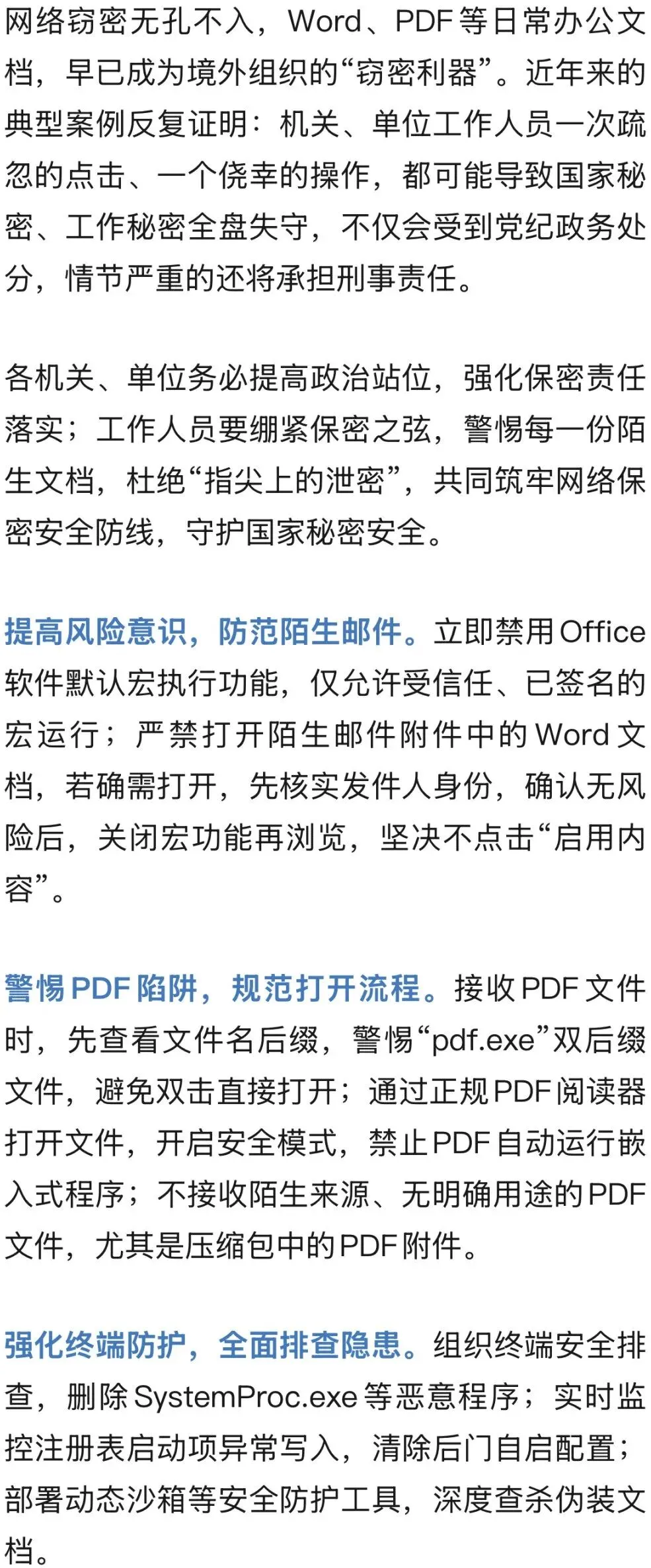 在机关、单位日常办公中,接收邮件、查阅文档是每日基础工作。但你是否想过,一份看似平常的DOC或PDF文档,可能正携带着窃取机密的恶意代码?