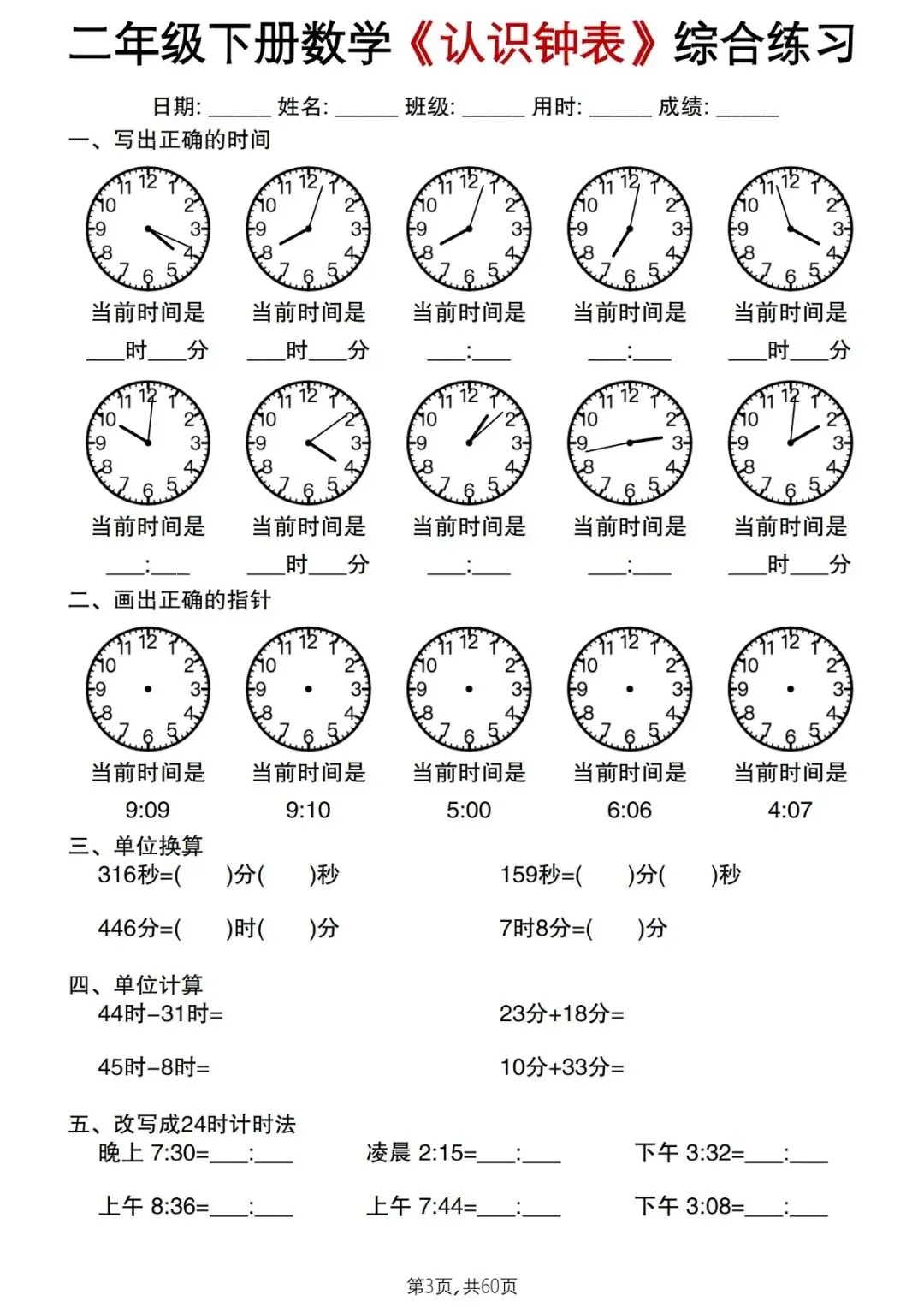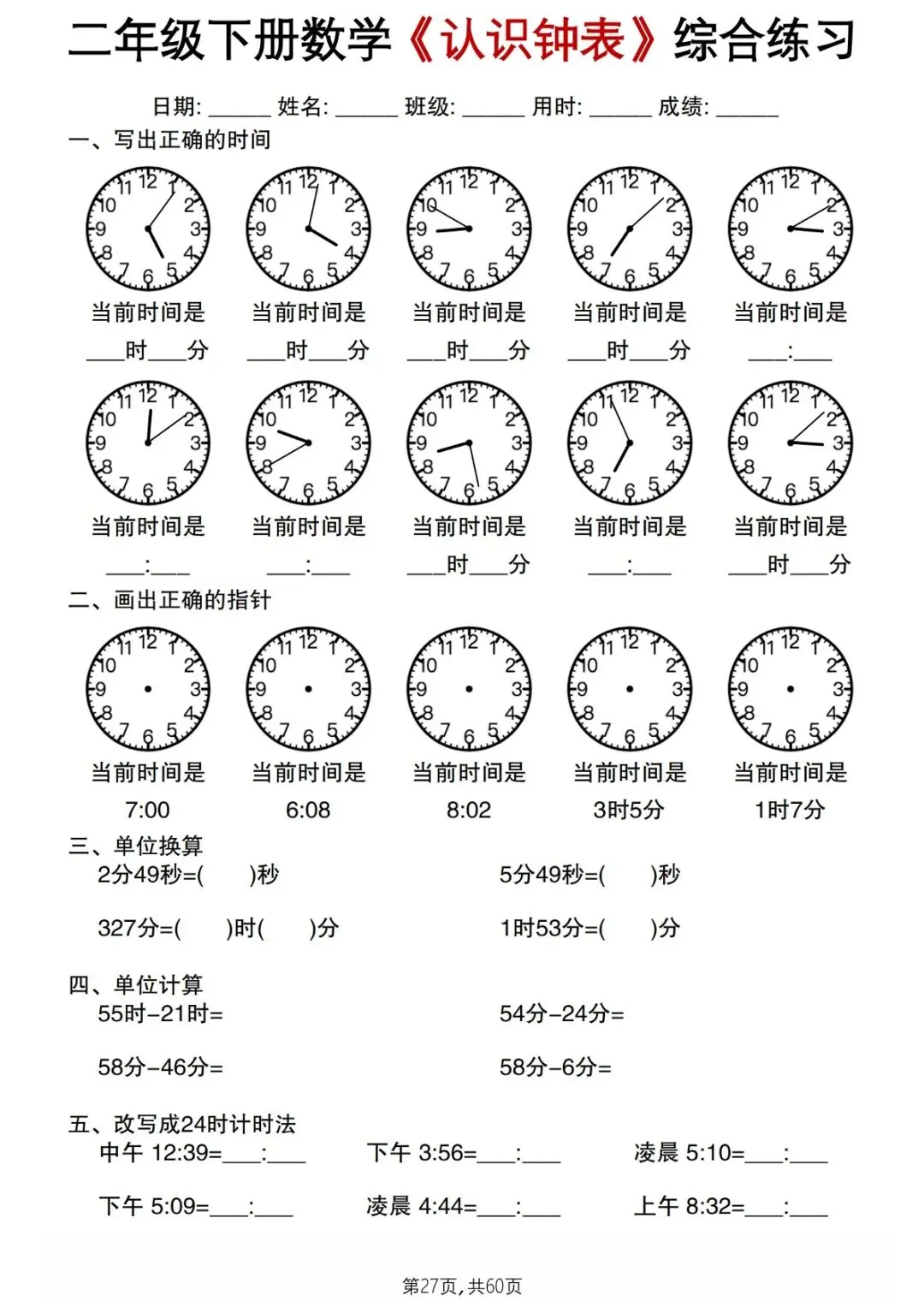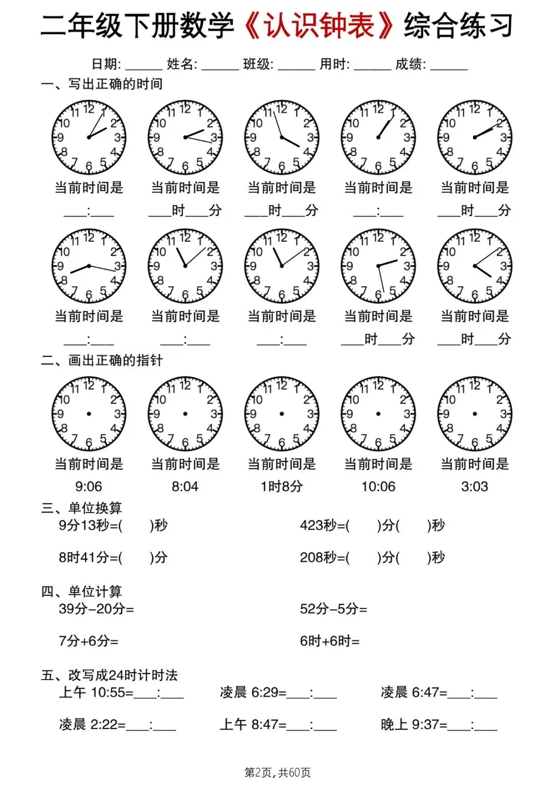 本资料专为2026 春季 二年级下册数学《认识钟表》单元编写,按基础→提升→综合梯度设计,覆盖整时、半时、几时几分、经过时间、时间推理等全考点,题型标准、难度适中,含完整答案,可直接打印,是一、二年级孩子巩固钟表知识、考前冲刺的综合练习资料。