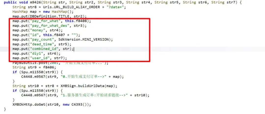 public void m9426(String str, String str2, String str3, String str4, String str5, String str6, String str7) {String str8 = Urls.URL_BUILD_ALIAY_ORDER + "?data=";HashMap map = new HashMap();map.put(DBDefinition.TITLE, str2);map.put("pay_for_what", this.f8408);map.put("pay_for_what_des", str3);map.put("money", str4);map.put("id", this.f8407 + "");map.put("pay_count", SdkVersion.MINI_VERSION);map.put("dead_time", str5);map.put("combined_id", str);map.put("diy1", str6);map.put("user_id", str7);PayBusUtils.post(2001, "开始生成支付订单...");String str9 = f8406;if (Spu.m11550(str9)) {C4448.m9567(str9, "0.开始生成支付订单-->" + map);}String str10 = str8 + XMBSign.buildUrlData(map);if (Spu.m11550(str9)) {C4448.m9567(str9, "1.服务器生成订单:开始请求链接-->" + str10);}XMBOkHttp.doGet(str10, new C4393());}