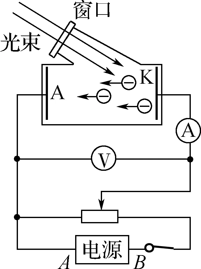 【解析】 实验研究遏止电压随光照频率的变化规律,即实验时光电管两端应接反向电压,电源的正极接光电管的阴极,电源的B端为正极,故A错误;由光电效应方程 eUc=hν-W0,得出遏止电压Uc=hνe-W0e,图线斜率为k时,普朗克常量为h=ke,故B错误;用某色光照射金属板时不能发生光电效应,增大光强时也不能发生光电效应,则电流表无示数,故C错误;该电路中光电管两侧的电压为反向电压,向右移动滑动变阻器时,光电管上的反向电压增大,则电流表示数将变小,甚至变为零,故D正确.