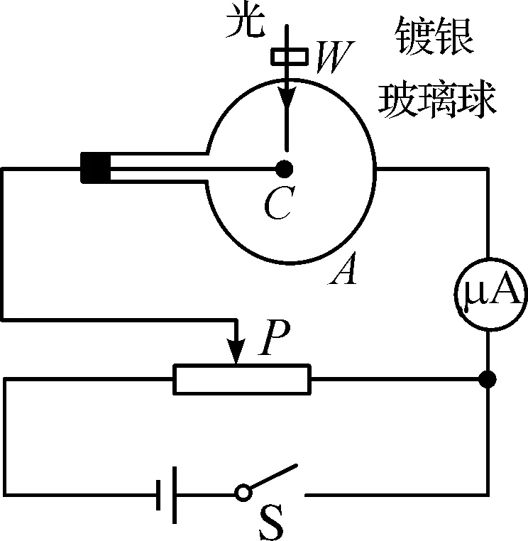 6. (2024·连云港第一次调研)如图所示为一种光电效应实验装置,其中A为内壁镀银的真空玻璃球,阴极金属球C被玻璃球A包围且比A小得多,连接C的导线与镀银层不相连,连接微安表的导线与镀银层相连.一定强度的入射光穿过小窗W照射到C上时发生光电效应,打到镀银层上的光电子全部被吸收,微安表有示数.下列说法中正确的是( )