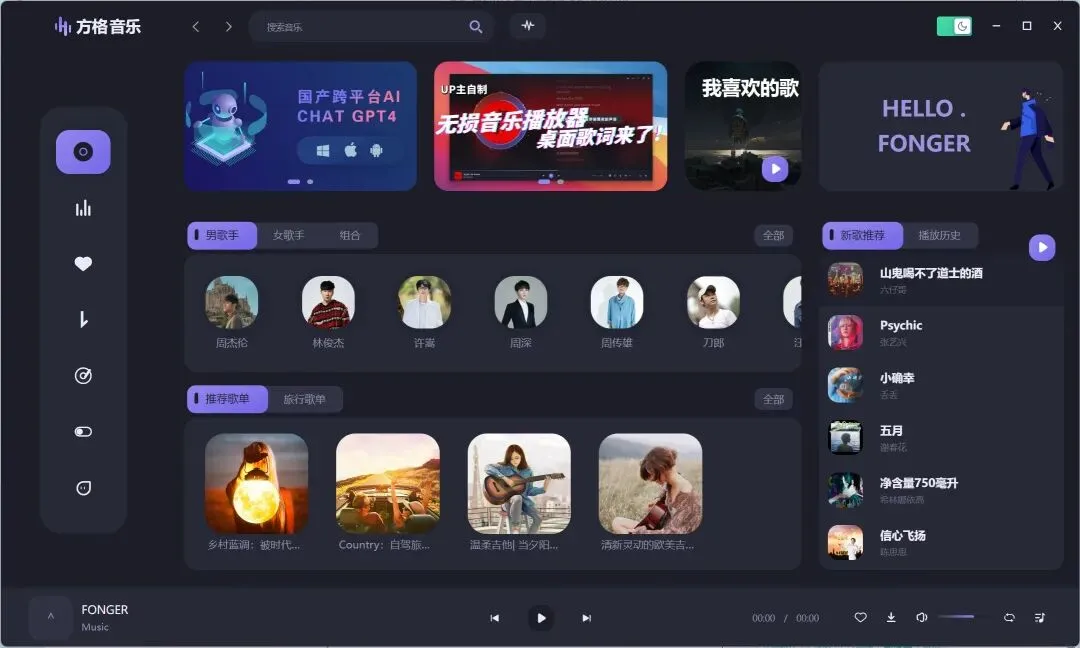 这软件界面挺直观的,一眼能看到“我喜欢的歌”,旁边有“播放历史”,找歌方便。还有“新歌推荐”和“主题歌单”,比如“旅行歌单”,探索新音乐挺方便。分类上,有“男歌手”、“女歌手”和“组合”,挺有创意。支持安卓和PC,随时随地都能享受音乐,用起来挺顺手。