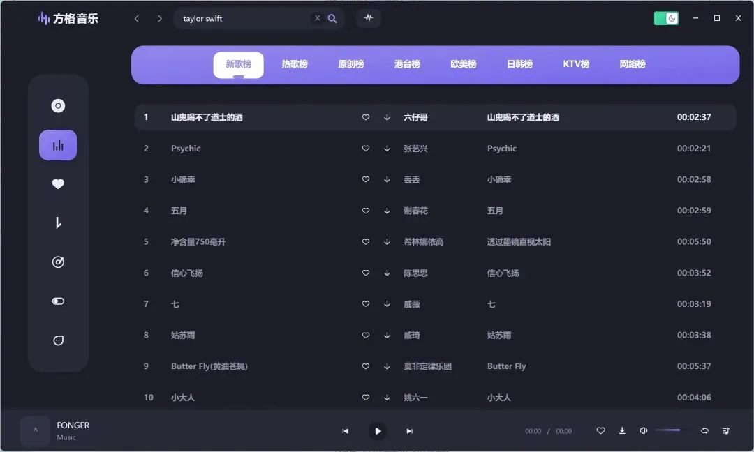 这界面挺简洁的,有各种音乐榜单,新歌、热歌、原创,还有按地区分的,想听啥类型的歌都能找到。歌曲列表里,每首都标有播放时间,方便筛选。底下还有个播放器,直接控制播放,用起来挺方便。