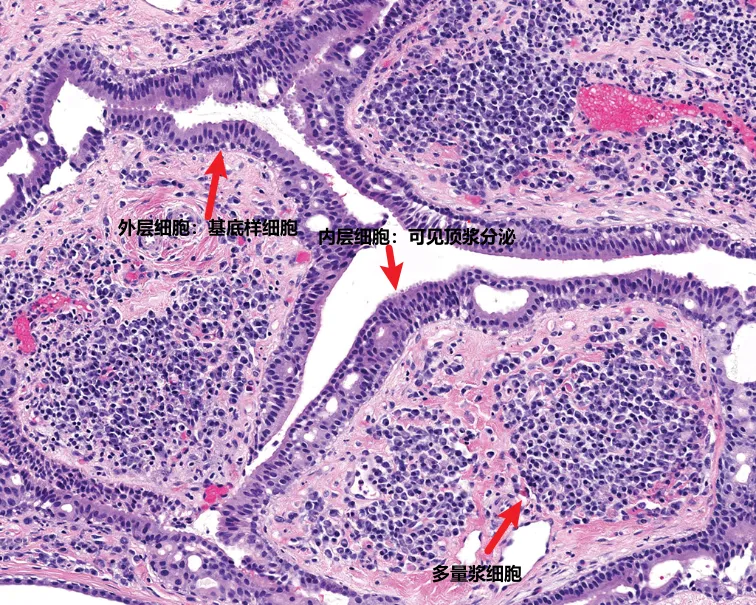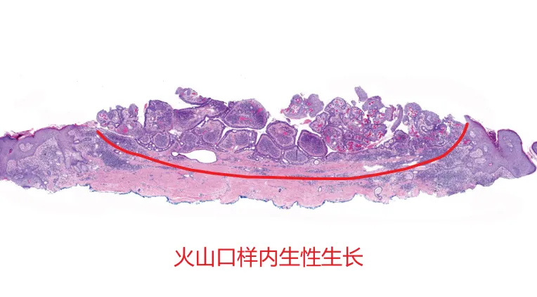 乳头状汗管囊腺瘤–简易说明 1、定义:乳头状汗管囊腺瘤是一种良性的大汗腺分化的肿瘤,可以独立发生,也可与皮脂腺痣相关。 2、90%发生于头颈部。 3、伴有MAPK信号通路激活突变,常可检测到BRAF、KRAS、HRAS突变。 4、组织病理特征:开口于表皮,呈内生性火山口样生长,形成简单乳头结构,乳头表面可见两种细胞:内层细胞(柱状,可见顶浆分泌,胞浆嗜酸性)及外层细胞(基底样/肌上皮样细胞),两种细胞呈双层/多层排列。乳头间质可见多量浆细胞。
