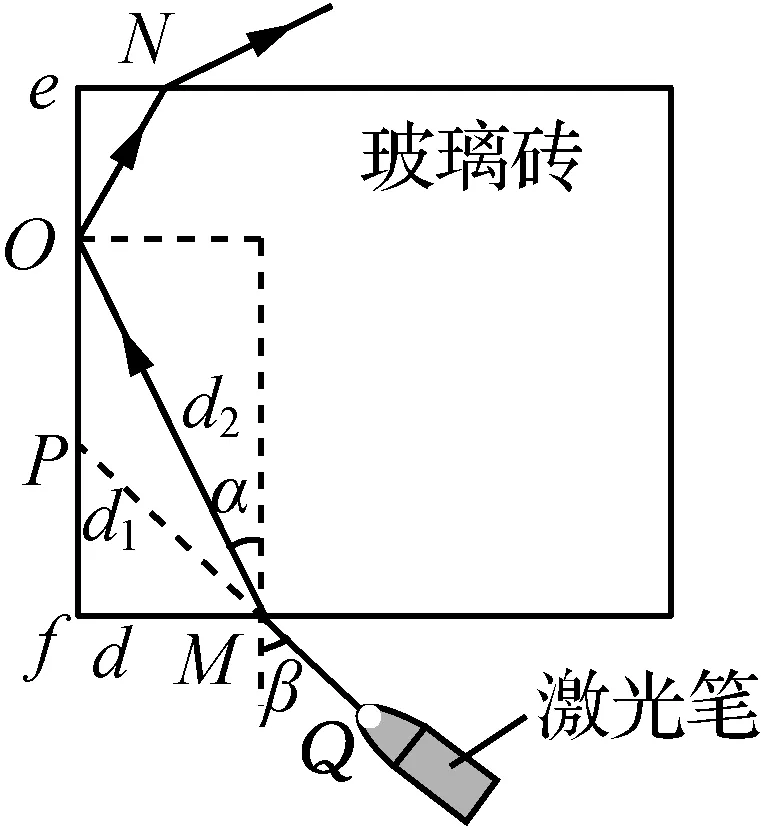 设Mf长度为d,由几何关系可知sin β=dd1,sin α=dd2,所以玻璃砖的折射率n=sin βsin α=d2d1,代入数据解得n=3.402.25=1.51.