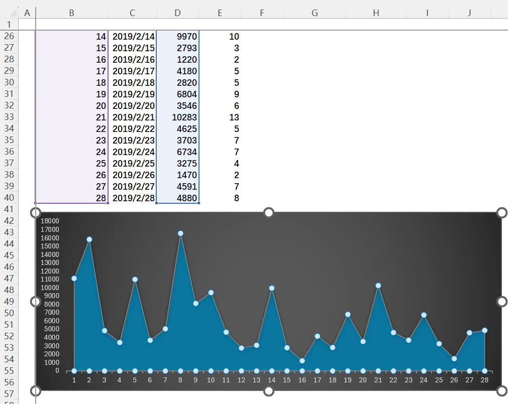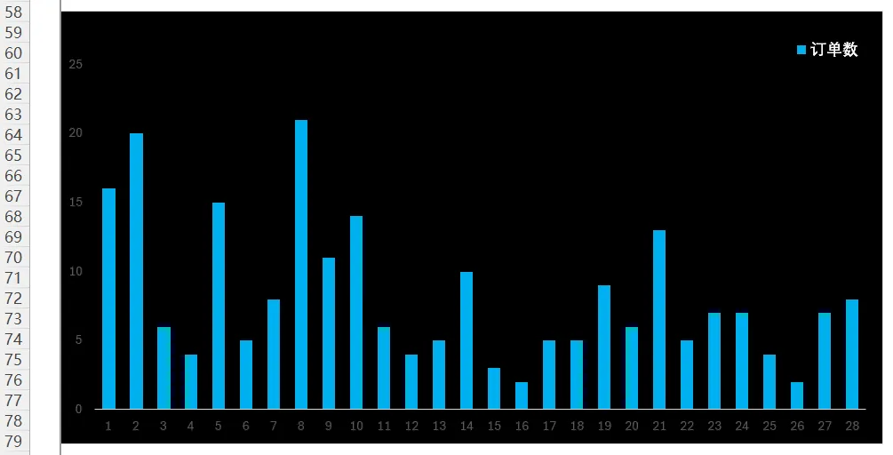 2)为了对该月份每天的销售额和订单数进行对比展示,再根据 B13:B43 和 E13:E43 单元格区域创建柱形图,如下图所示。