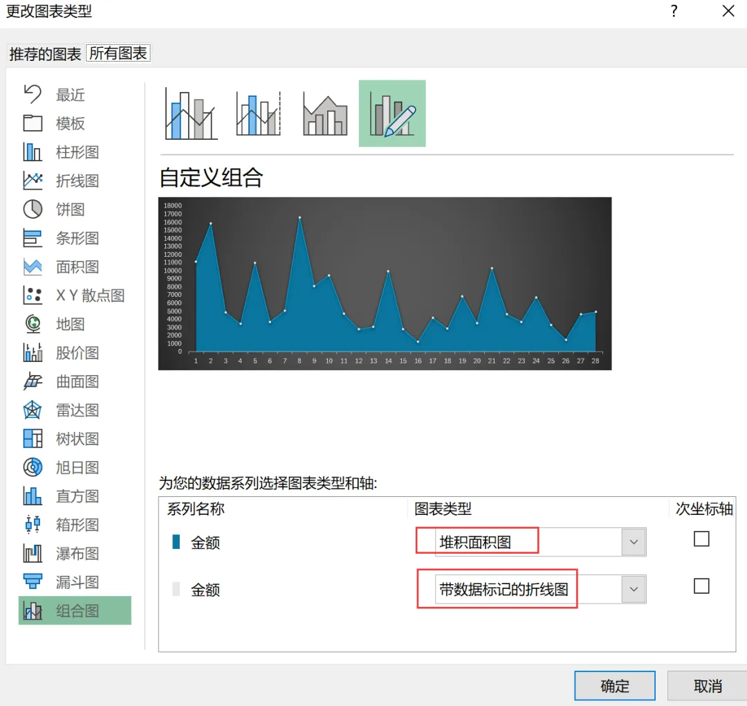 4. 改为组合图(折线 + 面积)