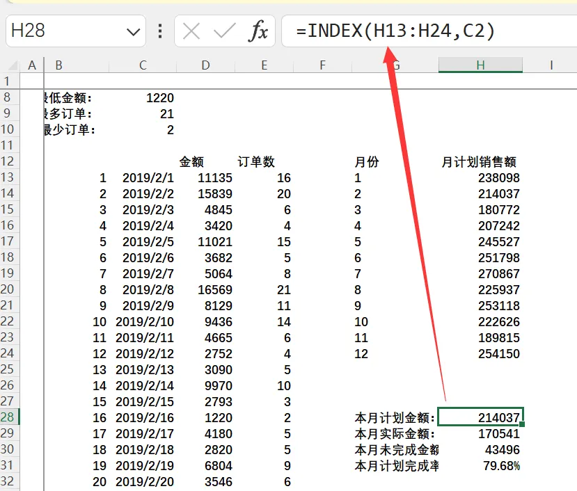 在 H31 单元格输入公式计算本月计划完成率: