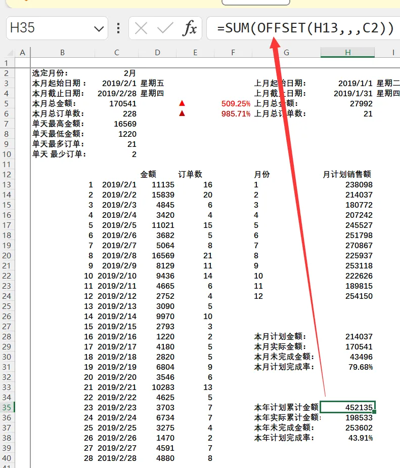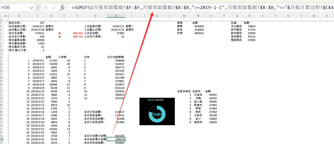 =SUMIFS(月报原始数据!$F:$F,月报原始数据!$B:$B,”>=2019-1-1″,月报原始数据!$B:$B,”<=”&月报计算过程!$C$4)