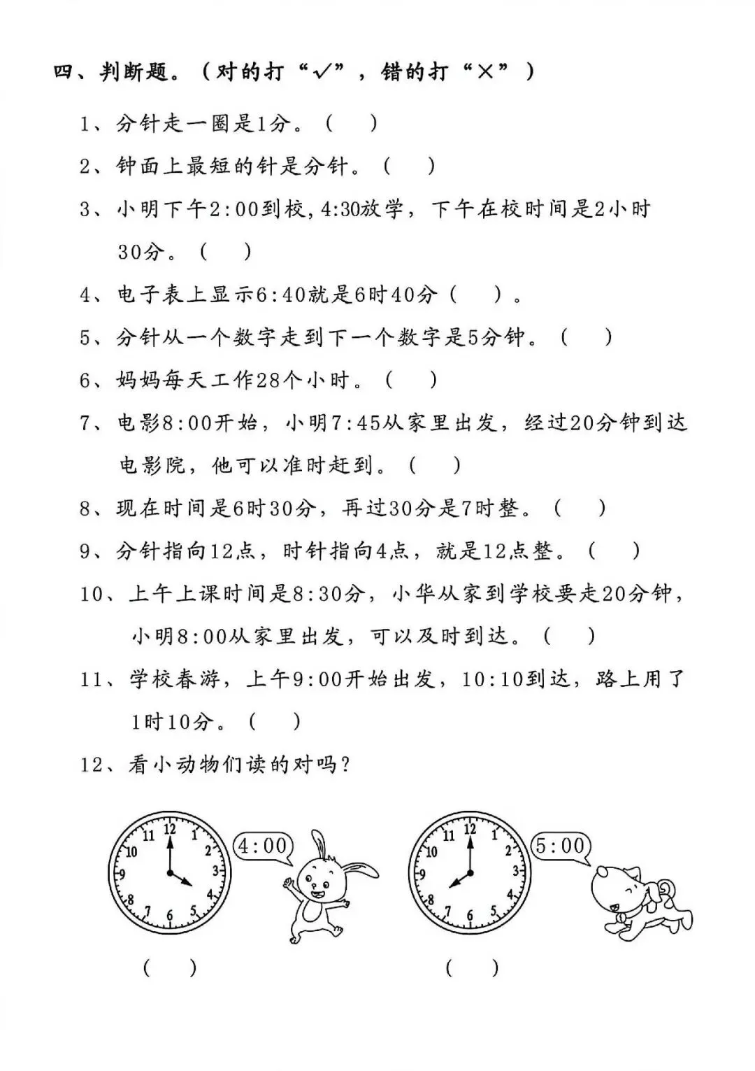 本资料同步人教版 2026 春二年级下册数学,专为认识钟表拔高培优设计,难度高于基础卷,侧重几时几分精准认读、经过时间计算、时间推理、生活情境应用题等拉分题型,适合学有余力学生冲刺满分,含答案,可直接打印。