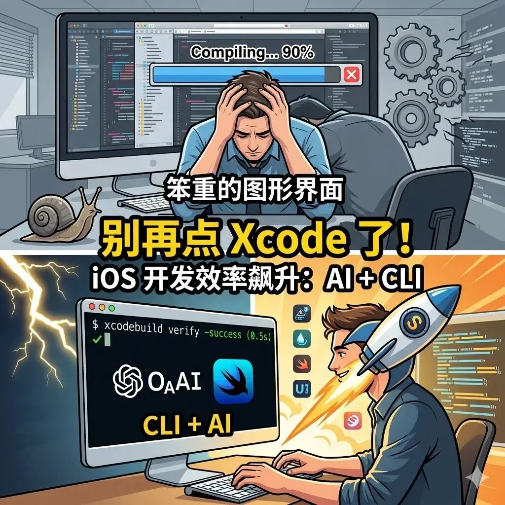 为什么这套思路重要?因为 Xcode GUI 虽然直观,但它在 AI 迭代场景下成了瓶颈。AI 每次生成代码后,你都要手动保存、切换窗口、点击 Run,整个过程容易中断思考。CLI 优先把这些步骤自动化,AI 直接调用命令行工具,验证结果秒级返回。你改一行代码,马上就能在模拟器里看到效果,中间几乎没有等待。