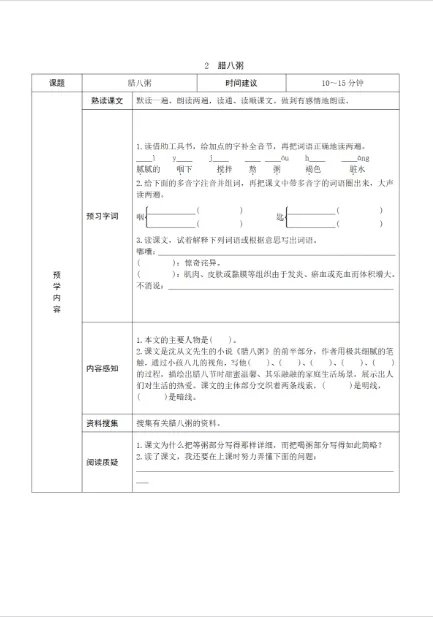 六年级(下)语文预习单,PDF电子版,可打印,免费下载