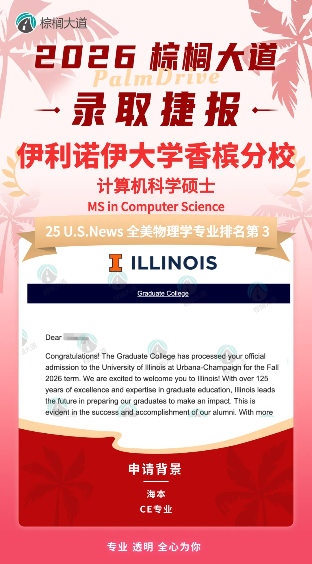 学员最终成功斩获全美CS专排Top 5的UIUC(伊利诺伊大学香槟分校)计算机科学硕士(MSCS)录取。该项目学制仅一年,以就业为导向,是北美 CS 硕士中公认的顶级跳板项目,毕业生广泛进入Google、Meta、Amazon等硅谷顶级科技公司,堪称冲击美国CS职场的最强起点之一。