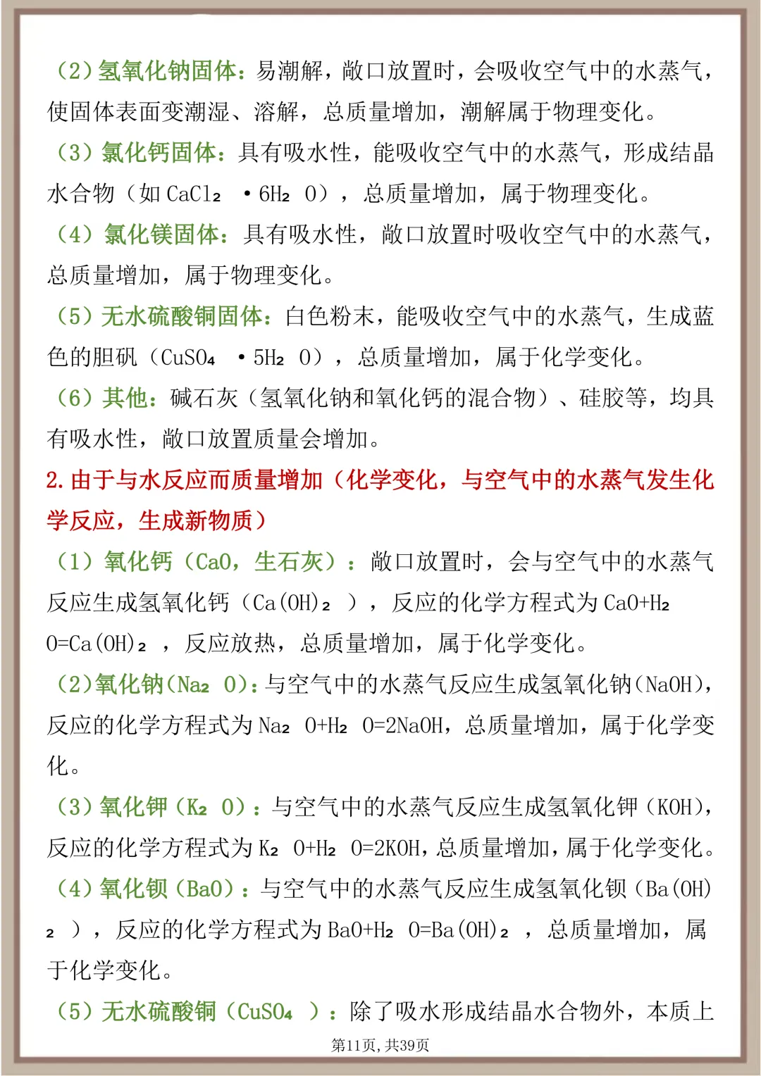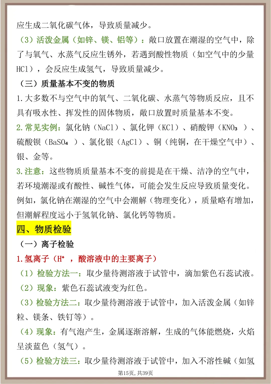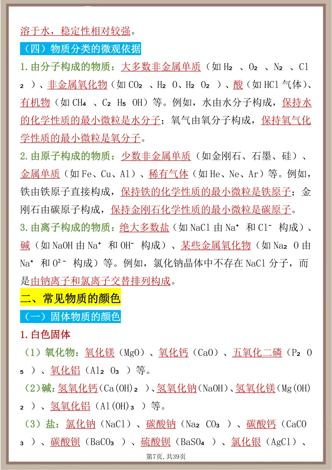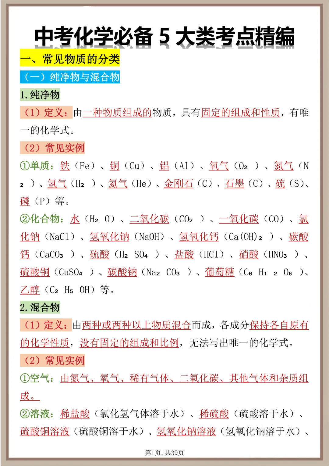 今天给大家整理了中考必备的【中考化学必备5大类考点精编】,覆盖常见物质分类、物质颜色、敞口放置质量变化、物质检验、化学核心之三全类型常考考点,附详细原理、易错辨析与完整知识点,不管题目如何变式,都能精准应对,轻松拿下高分!